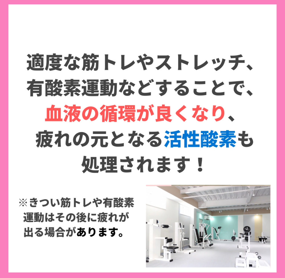疲れの元となる活性酸素も処理されます✨運動の他に、入浴や食生活、睡眠も重要です😆